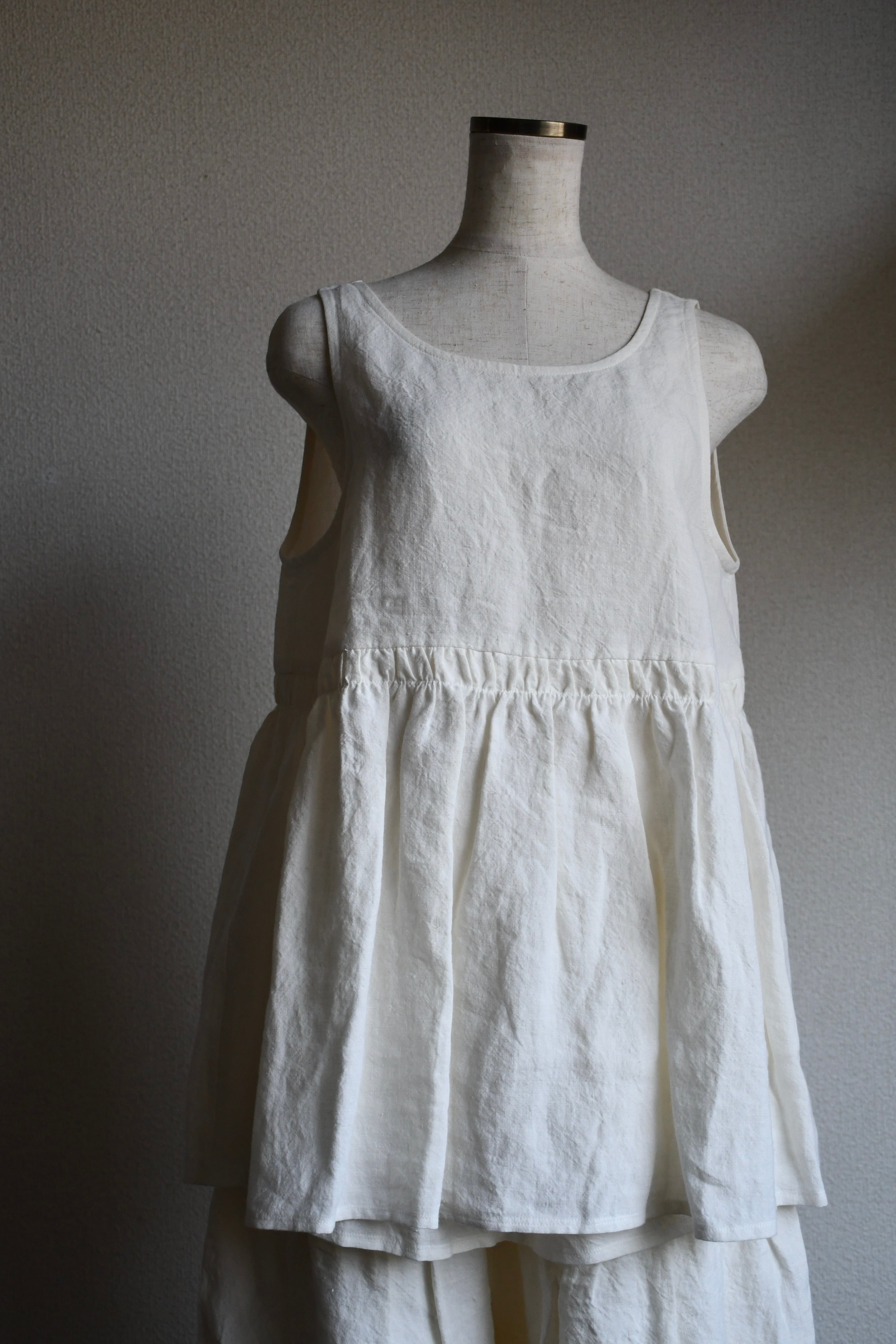 ラウンド型の襟とフリルが上品なリネンタンクトップ